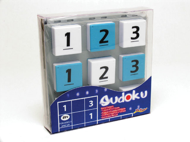 3x3 Sudoku PVC Box SetFEATURES:1 piece of 3 x 3 box / 9 pieces of numbered blocks / 3 x 3 Grid Size: 125 x125 mm / Instruction ManualFOR AGES 3 AND UPSingle Unit Pack: PVC Gift Box